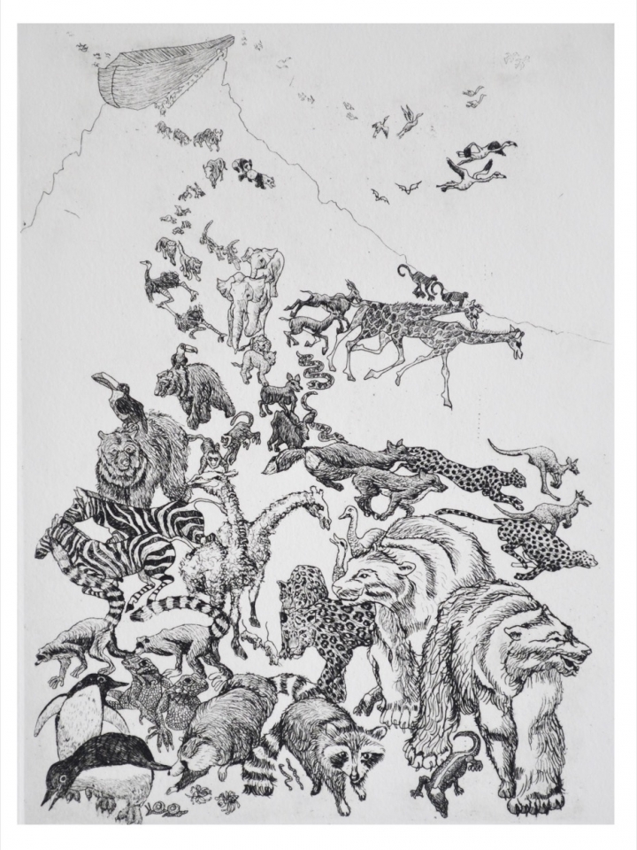 Book features 12 zinc plate etchings illustrating the New International Bible