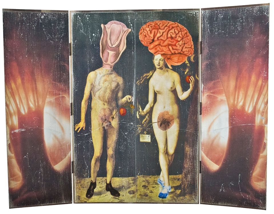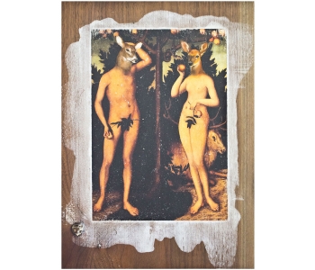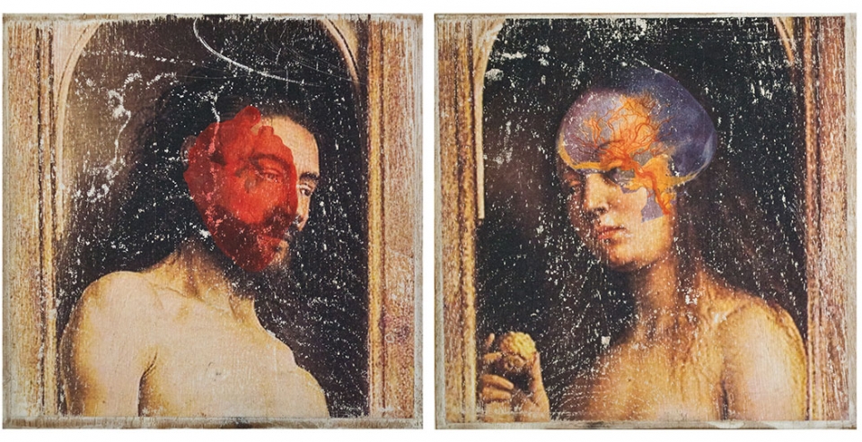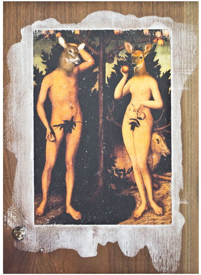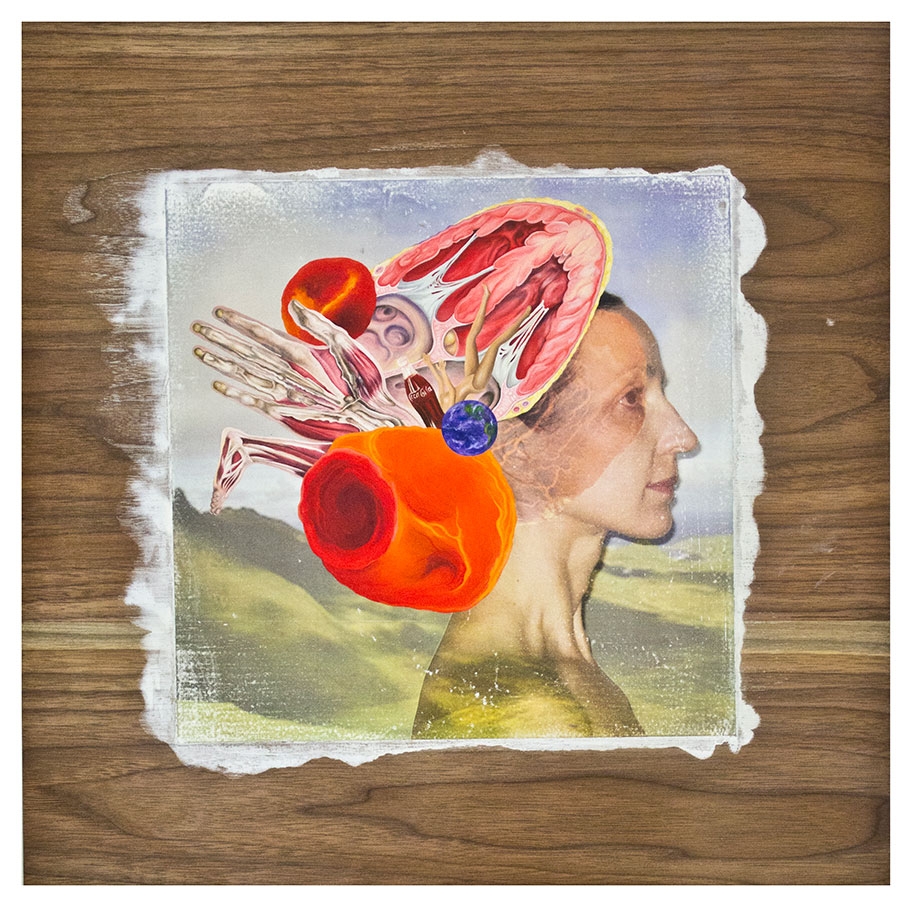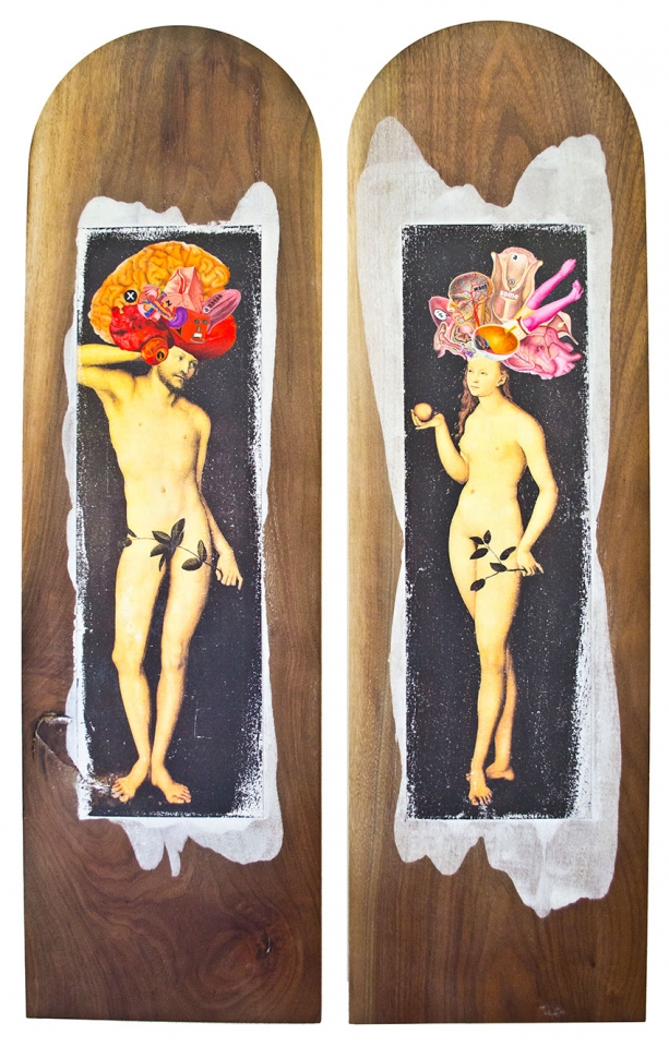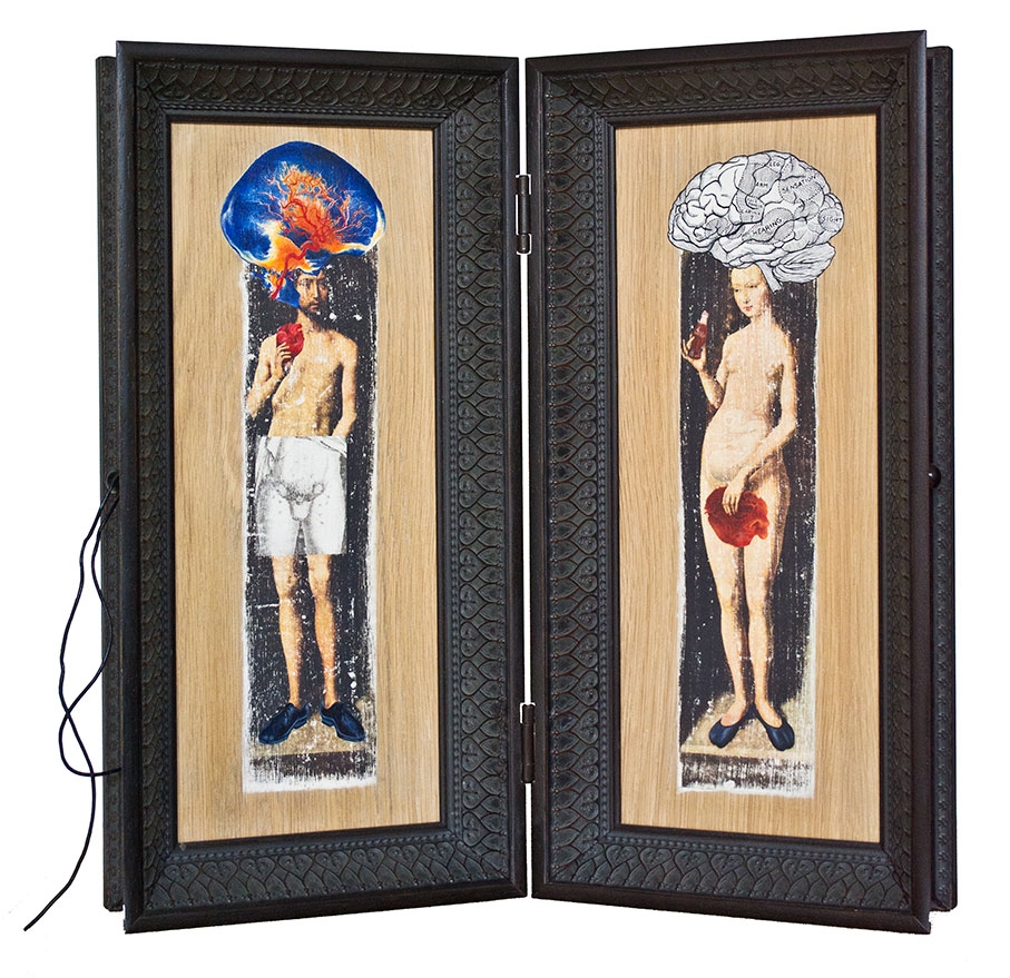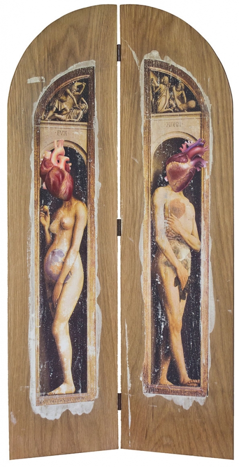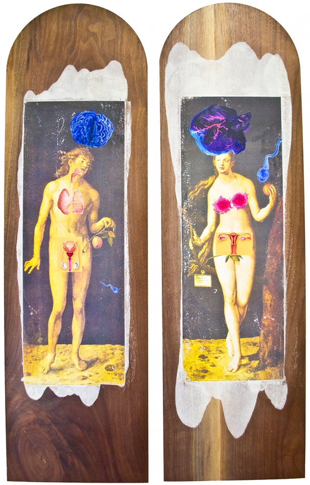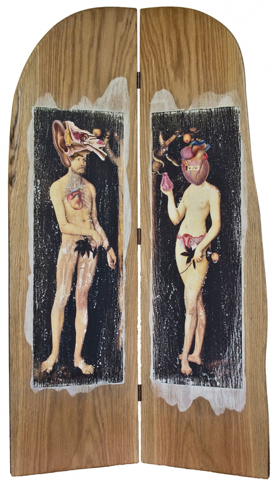 In this body of work I have created pictures in photoshop combining images from a variety of sources to celebrate a range of beliefs about our origins in a quirky, surreal way. I enjoy using Renaissance paintings, (Adam and Eve from Netherlandish paintings, animals from Bosch etc.) to represent ideas of God, faith, love, creation. These are combined with images from science books to represent evolution, manāmade, science, progress. The technique of gesso transfer allowed me to faithfully represent Renaissance paintings. Into these I built evolutionary concepts symbolised by organs and cells etc. In some ways the oil painted parts infer todays focus on scientific proof, which some see as challenging ideas of faith and a supreme creator. My belief is that faith and science work beautifully together as visually suggested in some of the work.