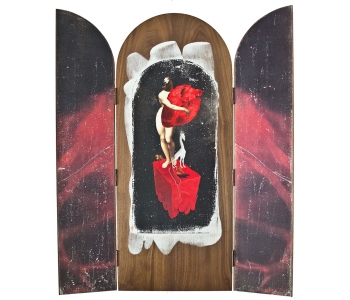 Alterpeace celebrates my love of titles and word play which is an important part of my practice. It references the altered peace we sometimes feel when confronted by surrealist art, similarly when our personal beliefs are challenged. And of course many of the historical images are from altarpieces with their rich narrative component. This body of work has been produced for my MFA at Canterbury University, School of Fine Arts.