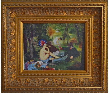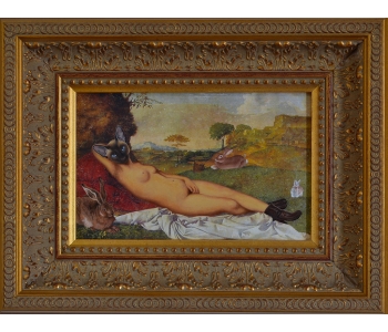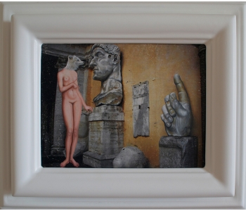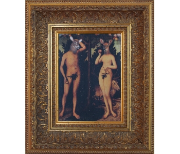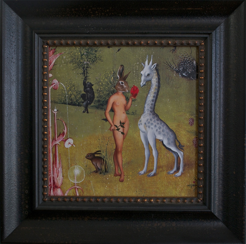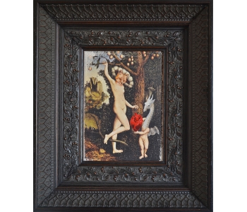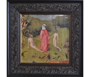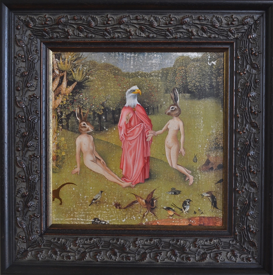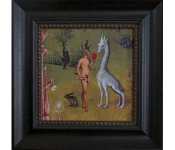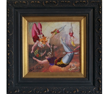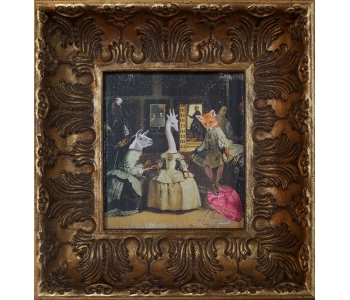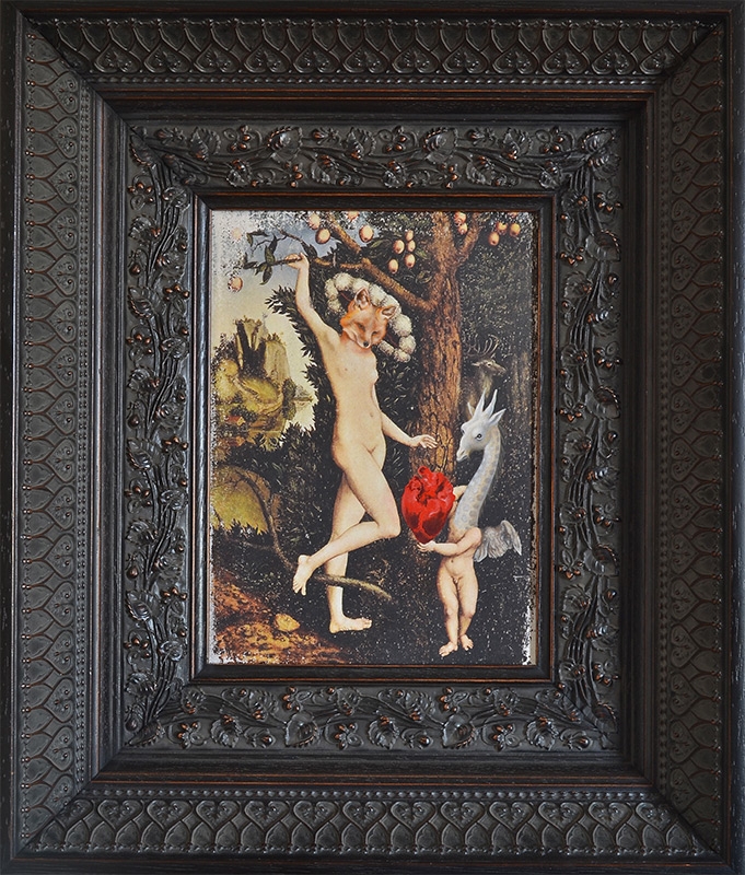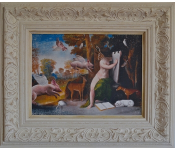 At the National Art Gallery of Victoria, Melbourne, I fell in love with the Schaeffer Gallery. - A room filled with bronze sculptures and opulently framed floor to ceiling paintings in the manner of the original french salons. This inspired me to create a series of paintings expanding on the stories of my sculptures, providing a stage for their performance. Gesso transfer onto walnut allows me to overtly reference historical paintings and their stories. The added oil painting transforms them into my own aesthetic and narrative interpretation.